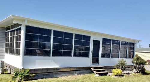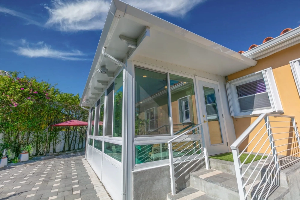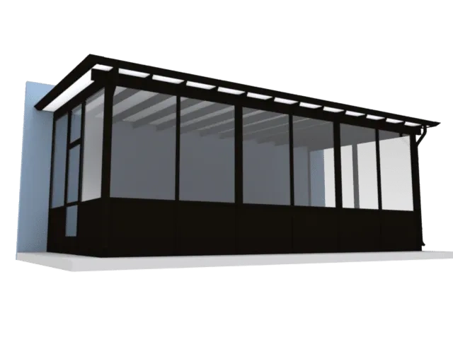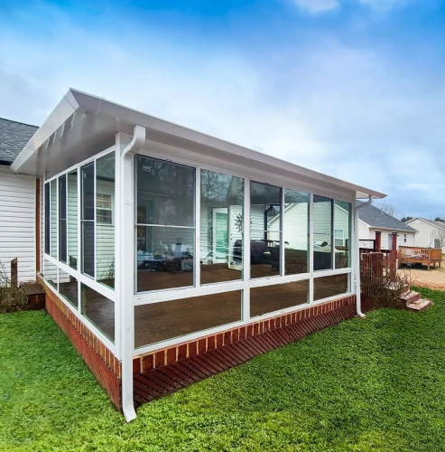 Enclosing your patio cover into a sunroom is a great way to not only enjoy the outdoors more, but also to add some space to your home. Any of our solid roof patios can be enclosed with vinyl windows or glass windows. Using our unique glass framing system, your local independent install can install a sunroom perfectly suits your home .Modern Materials